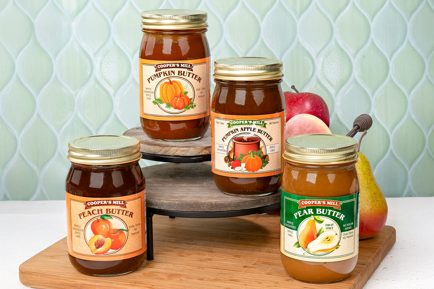 At Cooper’s Mill, our passion for creating delicious Apple & Fruit Butters shines through in every jar we produce. As a purveyor of fine homemade spreads, we take pride in offering a variety of delectable options, including Apple Butter, Peach Butter, Pear Butter, and Pumpkin Butter.